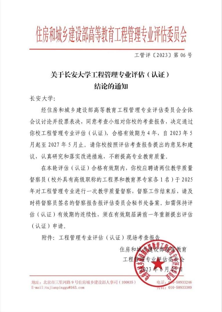 近期,住房城乡建设部高等教育工程管理专业评估委员会公布了《关于yl7703永利集团工程管理专业评估(认证)结论的通知》(工管评〔2023〕第06号),公司通过了工程管理专业评估(认证),合格有效期为4年,自2023年5月起至2027年5月止。