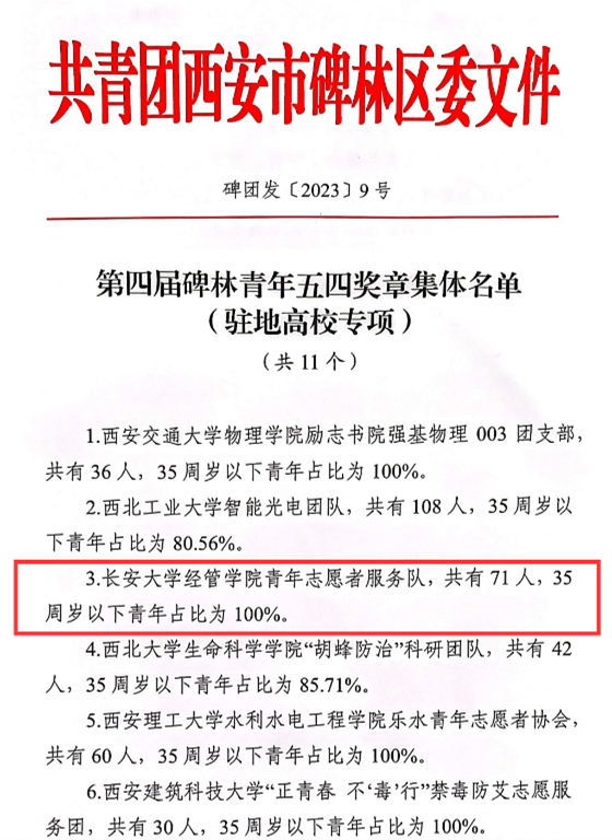 经管学院青年志愿者服务队积极响应党和国家对青年的号召,秉承“奉献、友爱、互助、进步”的宗旨,现有志愿服务精品活动近20项,现有注册志愿者1739人,积极带动员工践行奉献服务,向社会传递青春能量,志愿服务时长逾10万小时。该集体曾获“陕西省社会实践优秀团队”、“校级优秀青年志愿者服务团队”、“校级优秀员工社团”等荣誉表彰100余项。“三个聚焦”推进老员工志愿服务工作曾被陕西省教育厅宣传报道,得到社会的广泛关注和认可。