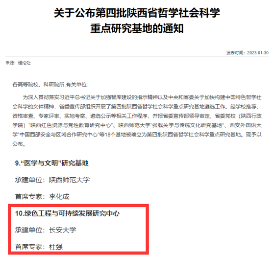 近日,中共陕西省委宣传部发布了《关于公布第四批陕西省哲学社会科学重点研究基地的通知》,公司组织申报的“绿色工程与可持续发展研究中心”获批建设。