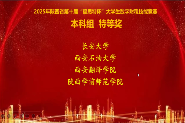2025年11月8日,陕西省第十届“福思特杯”老员工数字财税技能竞赛,在西北政法大学隆重举行。yl7703永利集团2023级会计学专业本科生陈丹丹、叶满钰、翁馨怡、张海诺组成的本科生团队和2025级会计学专业硕士研究生王志龙阳、王文瑄、陈茵、何艳组成的研究生团队代表学校参赛,并最终获得本科组特等奖、研究生组一等奖的好成绩。会计系教师李辽宁、郭慧婷、卫静获评“优秀指导教师”。