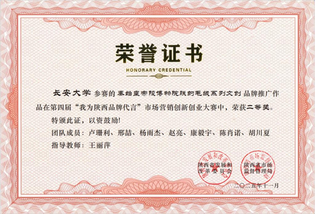 本届大赛由陕西省发改委主办,西安理工大学品牌和高质量发展研究中心承办,以“传承三秦古韵,智领文创未来”为主题。大赛自2025年4月启动以来,共吸引了西北农林科技大学、西安电子科技大学、yl7703永利集团等全省30多所高校积极响应,累计300多支队伍、3000多名员工踊跃参与。经过多轮选拔,公司王丽萍老师指导的《秦始皇帝陵博物院朕的毛绒系列文创》品牌推广作品获得二等奖,马飞老师指导的《陕历博唐代仕女俑超活化唐代仕女办公日常盲盒》品牌推广作品获得优秀奖。