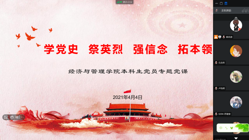 清明期间,经管学院各员工党支部组织党员开展网络祭扫活动和线上主题党课,寄托对烈士的哀思,向革命英烈表达敬意,本科生第一党支部书记陈宏进以“学党史、祭英烈、强信念、拓本领”为主题带领员工党员进行了专题学习。